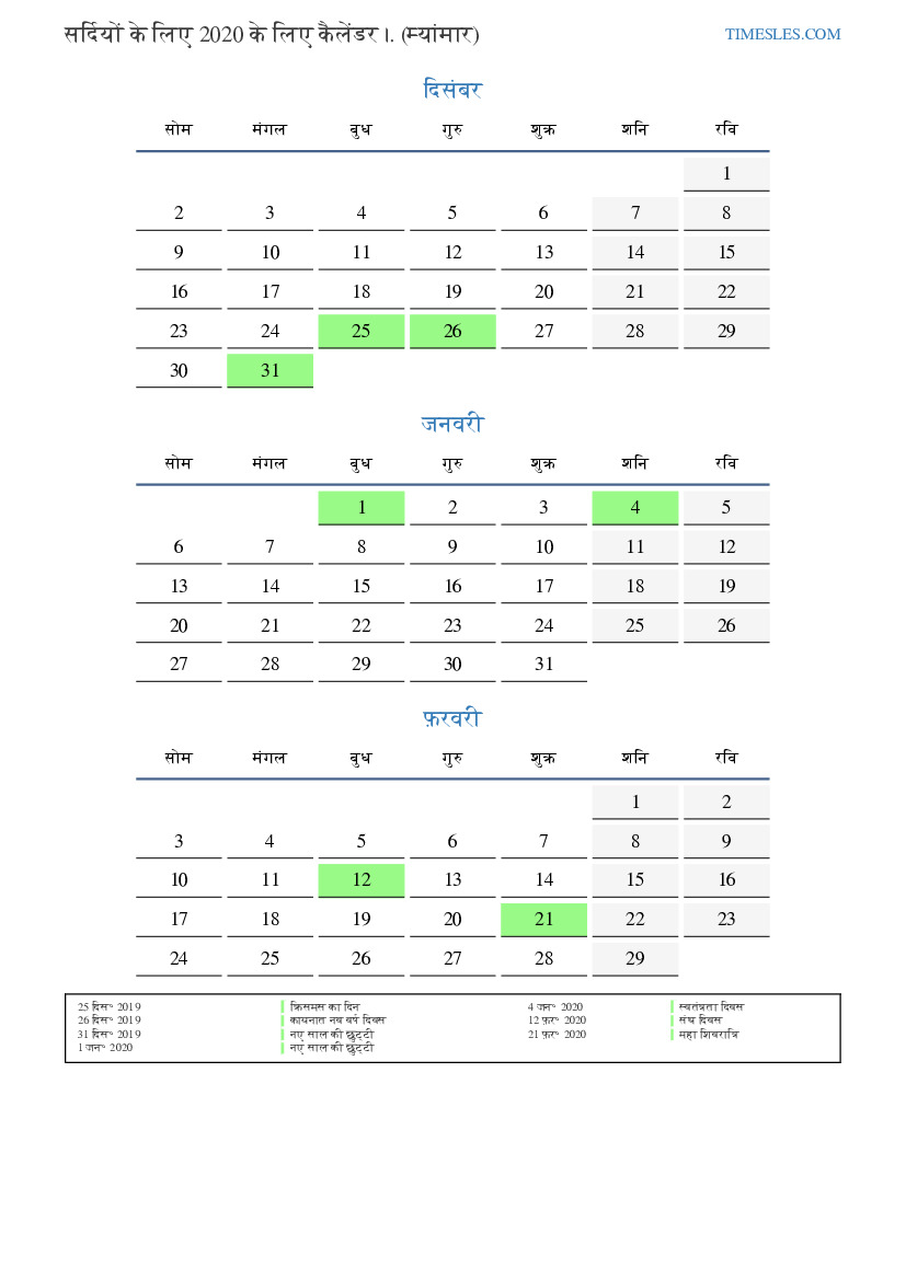 सर्दियों के लिए कैलेंडर 2020 म्यांमार के लिए