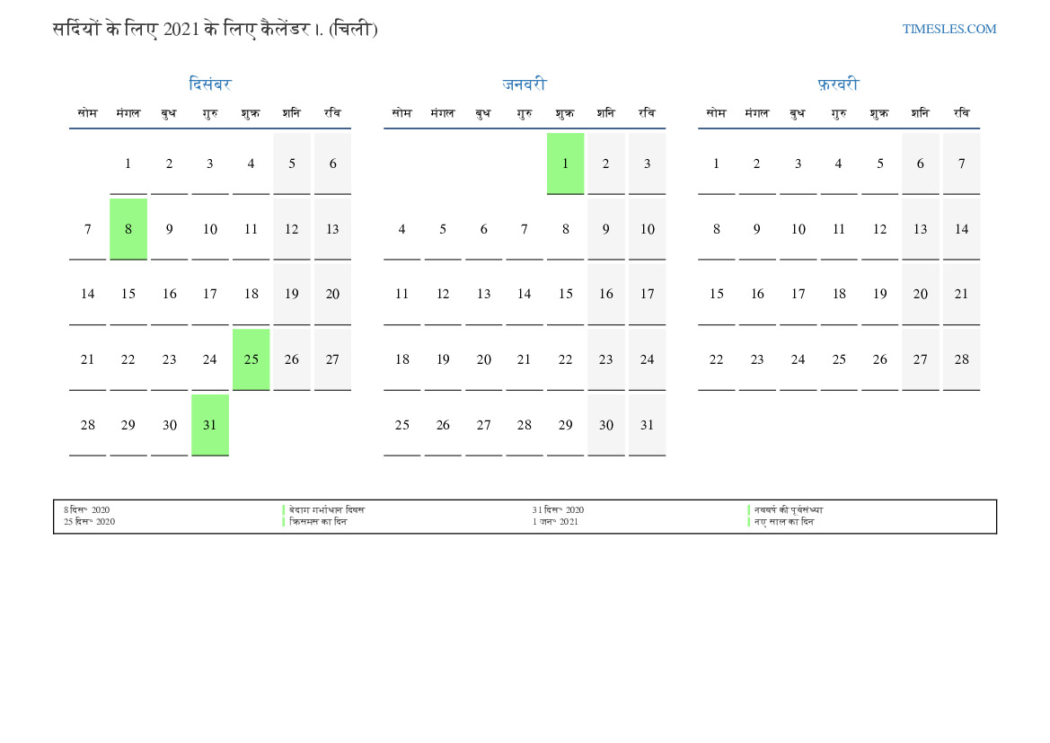 सर्दियों के लिए कैलेंडर 2021 चिली के लिए