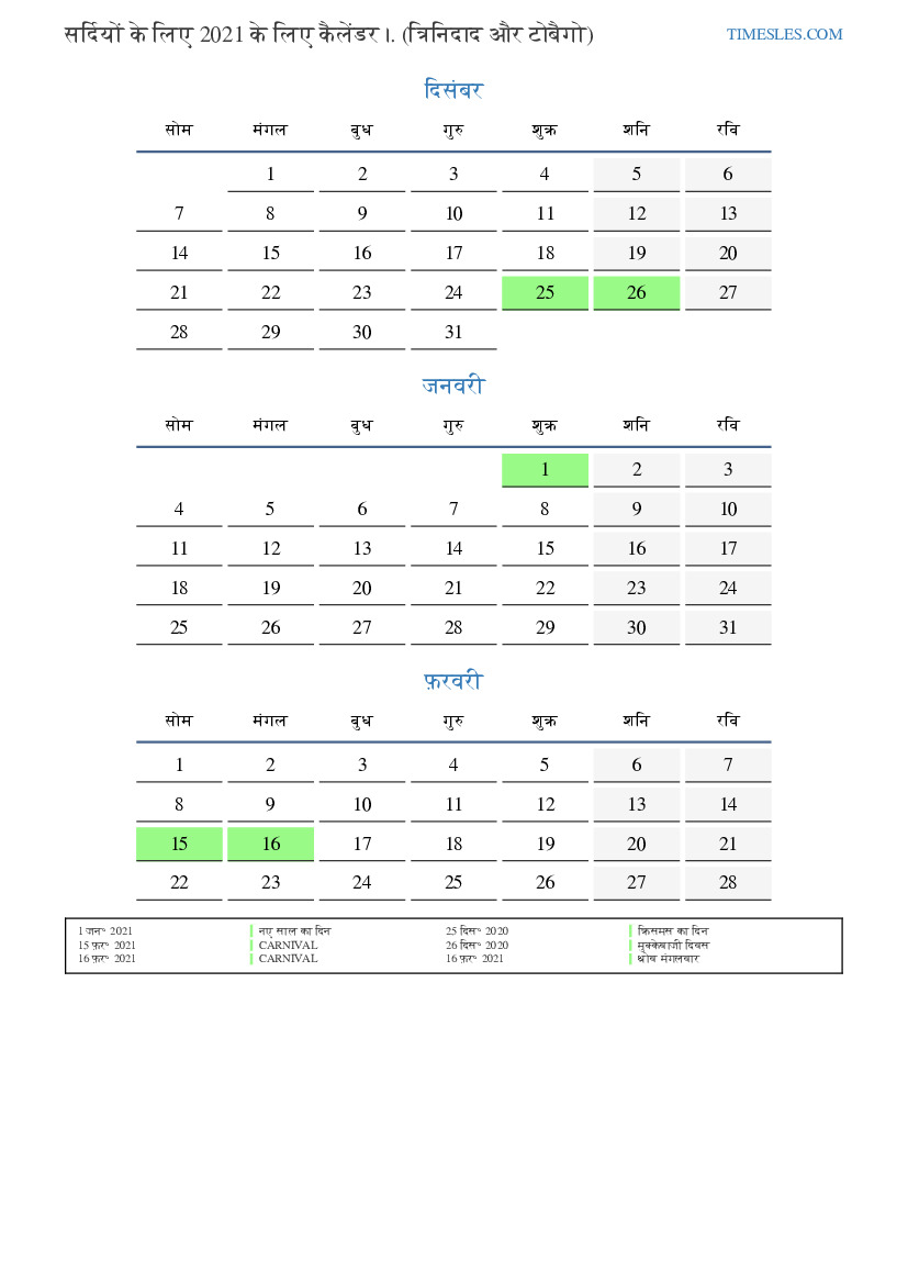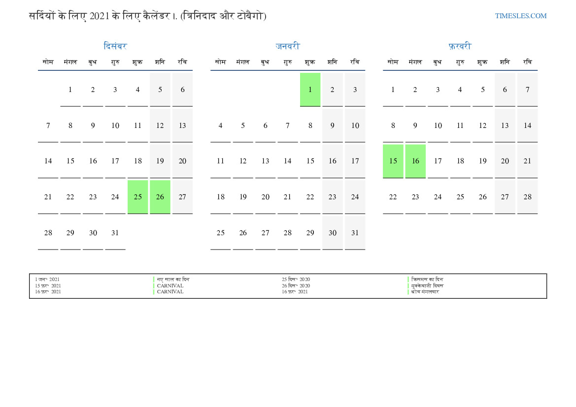 त्रिनिदाद और टोबैगो के लिए 2021 की सर्दियों के लिए छुट्टियों और सप्ताहांत का कैलेंडर