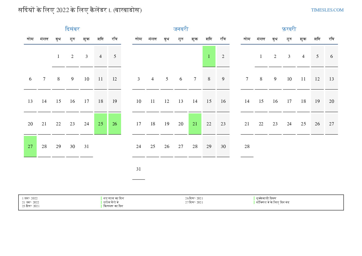 सर्दियों के लिए कैलेंडर 2022 बारबाडोस के लिए