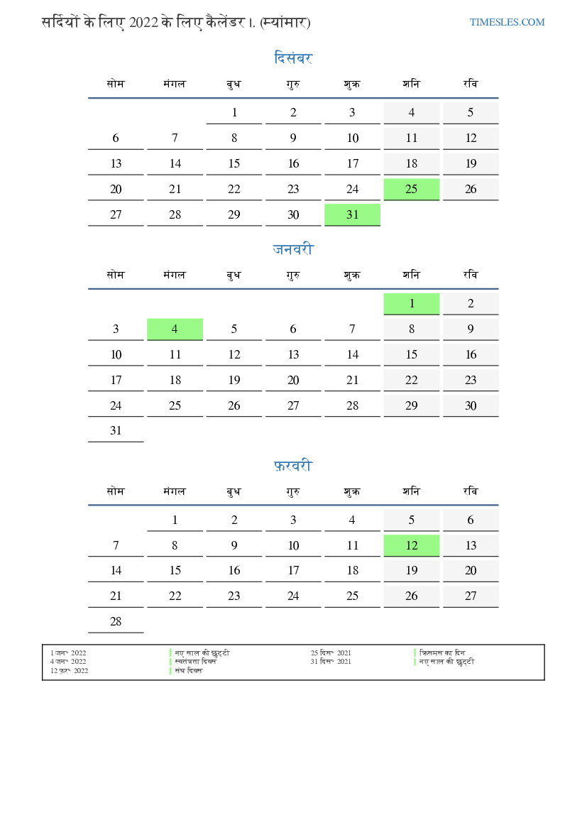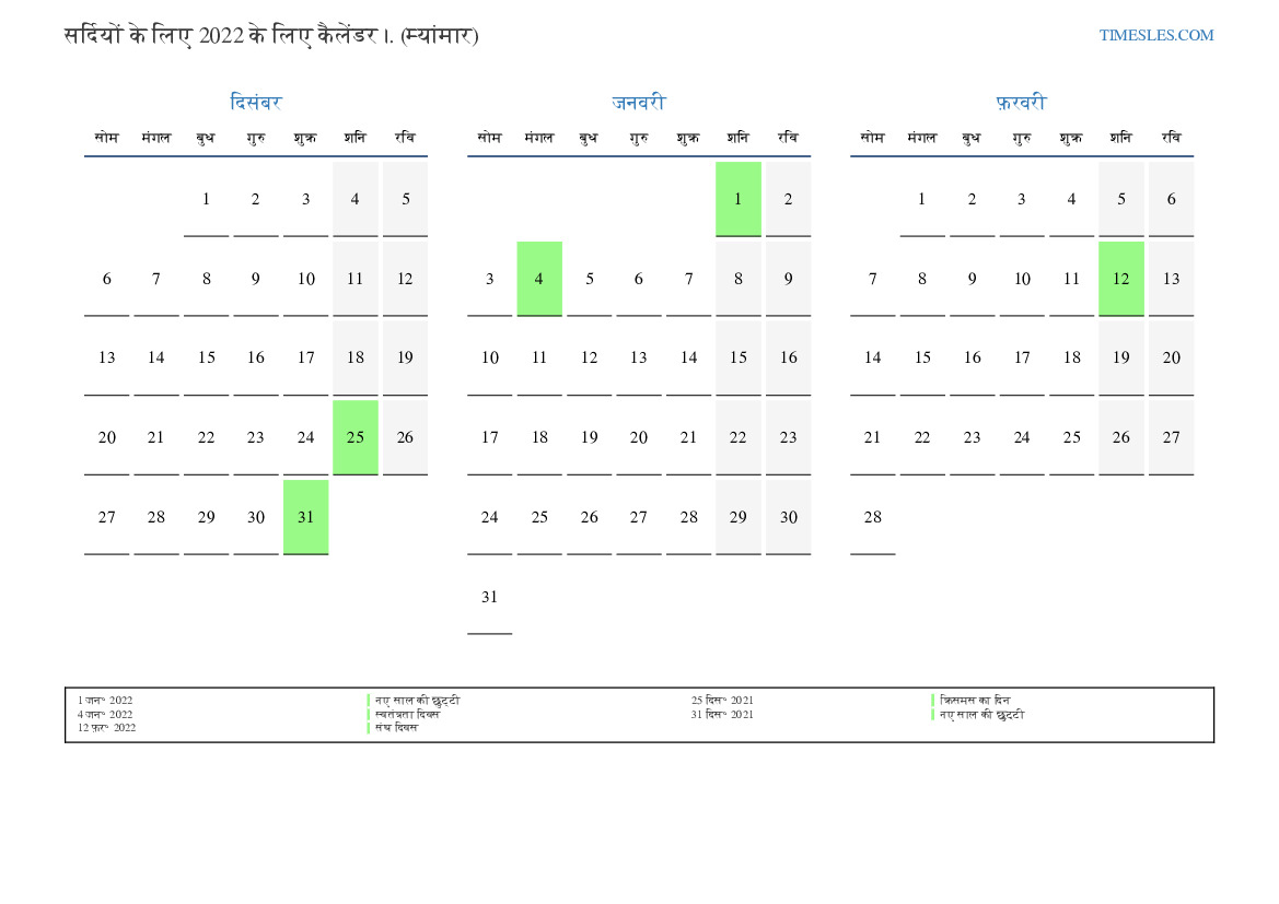 सर्दियों के लिए कैलेंडर 2022 म्यांमार के लिए