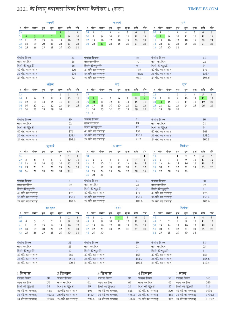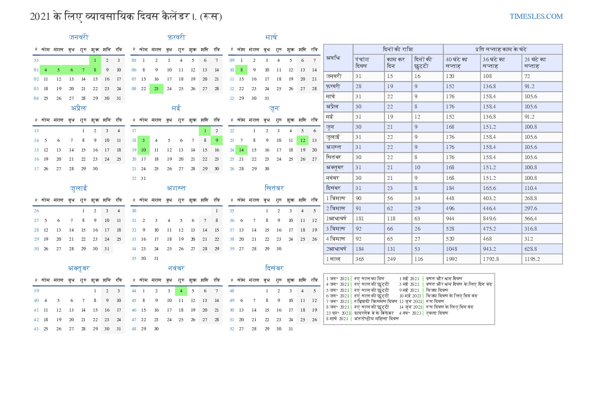रूस के लिए दिसंबर 2021 के लिए कार्य दिवस