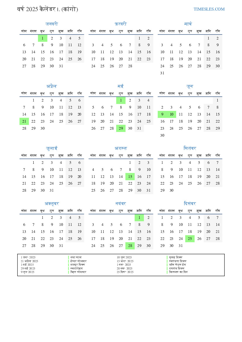 कांगो के लिए 2025 के लिए छुट्टियों और सप्ताहांत के साथ पीडीएफ कैलेंडर डाउनलोड और प्रिंट करें