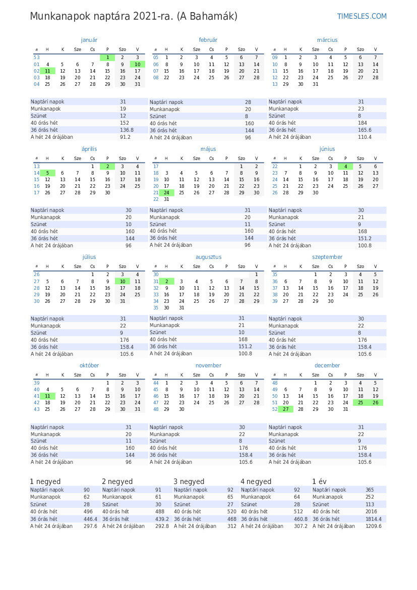 2021 1. negyedévére 6 ünnep és szabadnap van a Bahamákon. 2021 1. negyedéve pénteken kezdődik és szerdán ér véget.