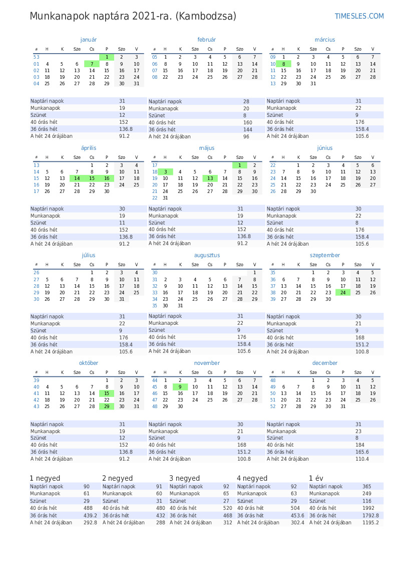 Üzleti naptár ünnepnapokkal és hétvégékkel 2021 3 negyedévére Kambodzsának