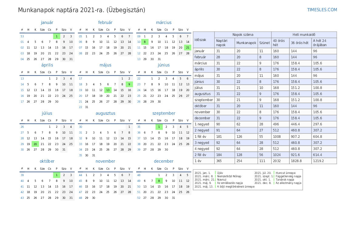 Üzleti naptár ünnepnapokkal és hétvégékkel 2021 3 negyedévére Üzbegisztán számára