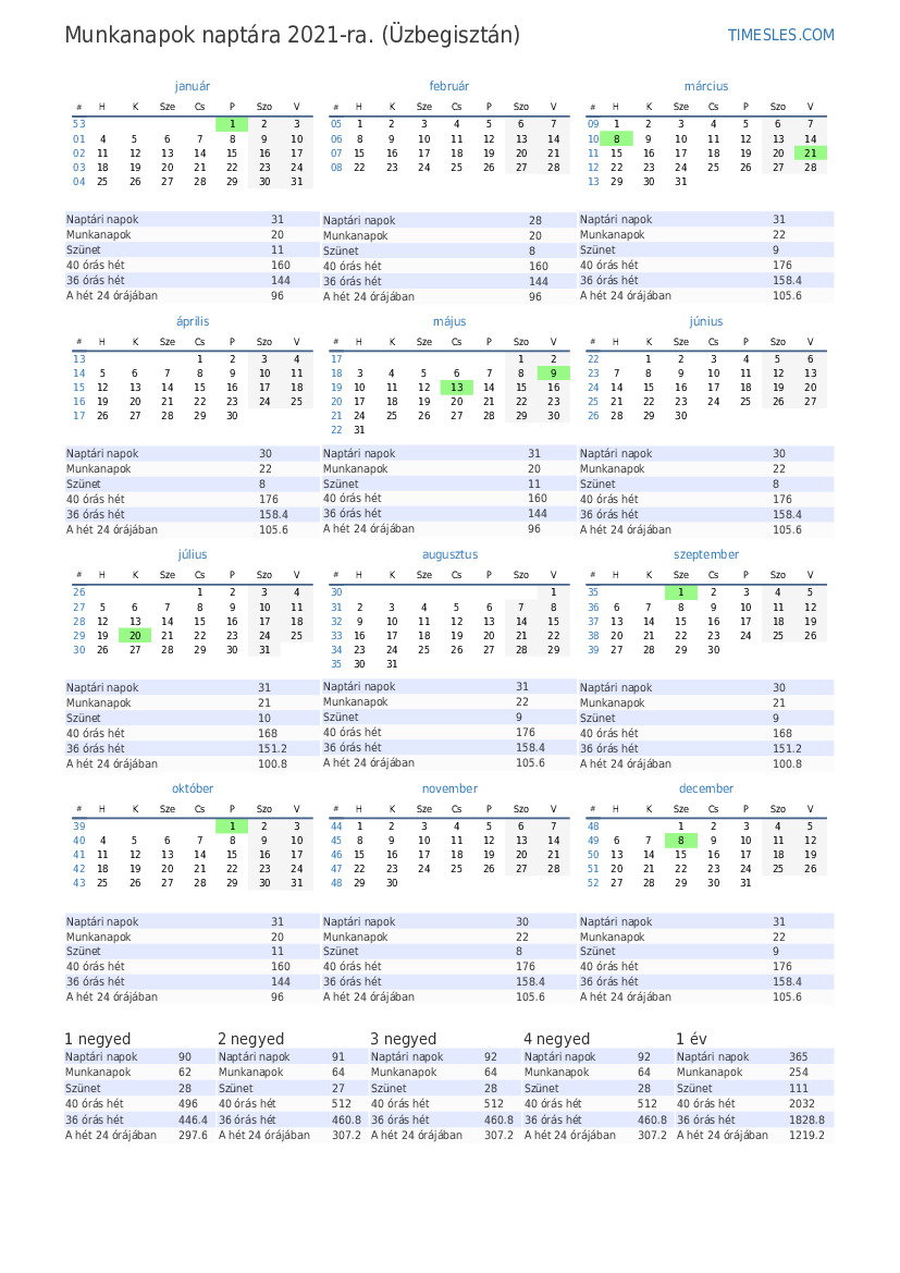 3. negyedévben naptár 2021 Üzbegisztán számára