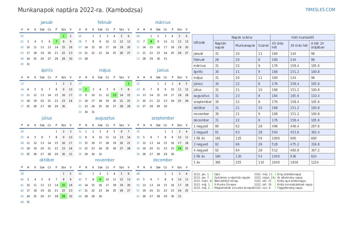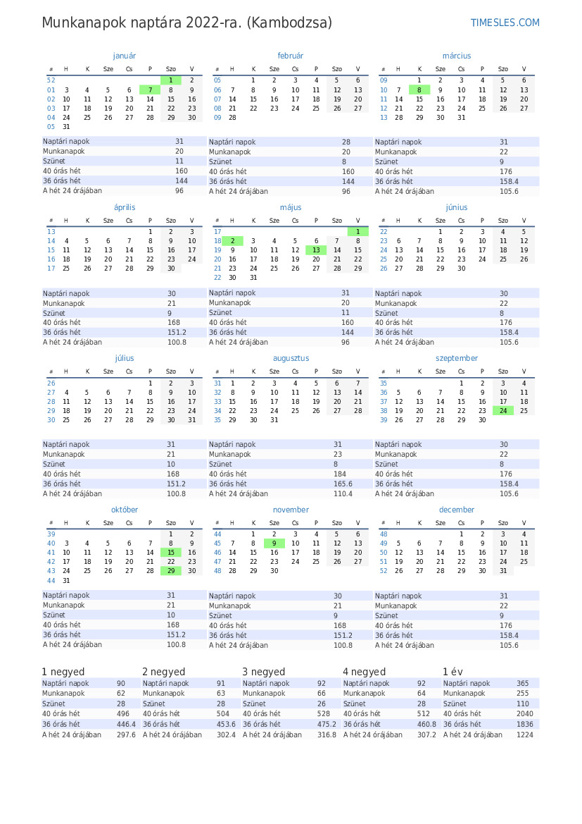 Üzleti naptár ünnepnapokkal és hétvégékkel 2022 3 negyedévére Kambodzsának