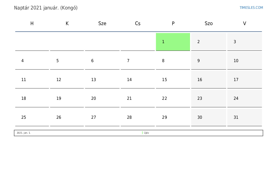 Ünnepek és hétvégi naptár 2021 január Kongó számára