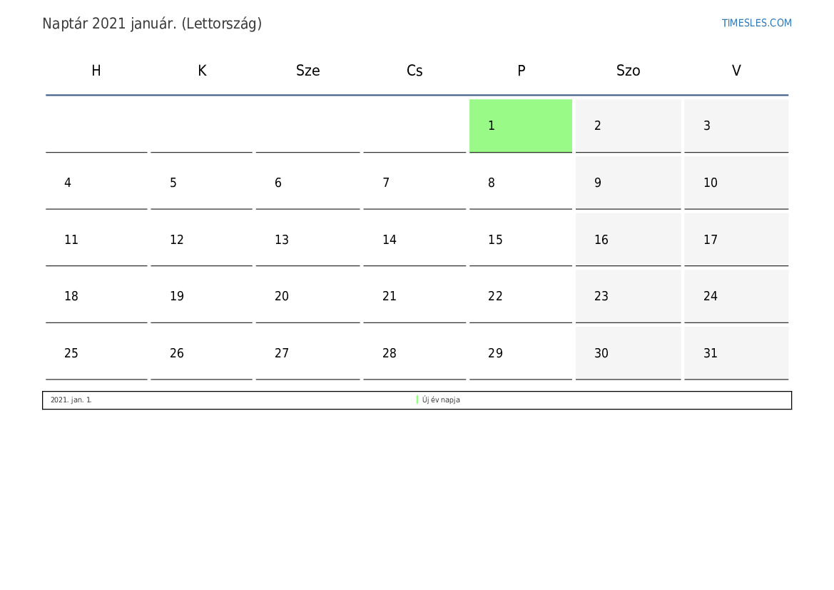 Ünnepek és hétvégi naptár 2021 január Lettország számára