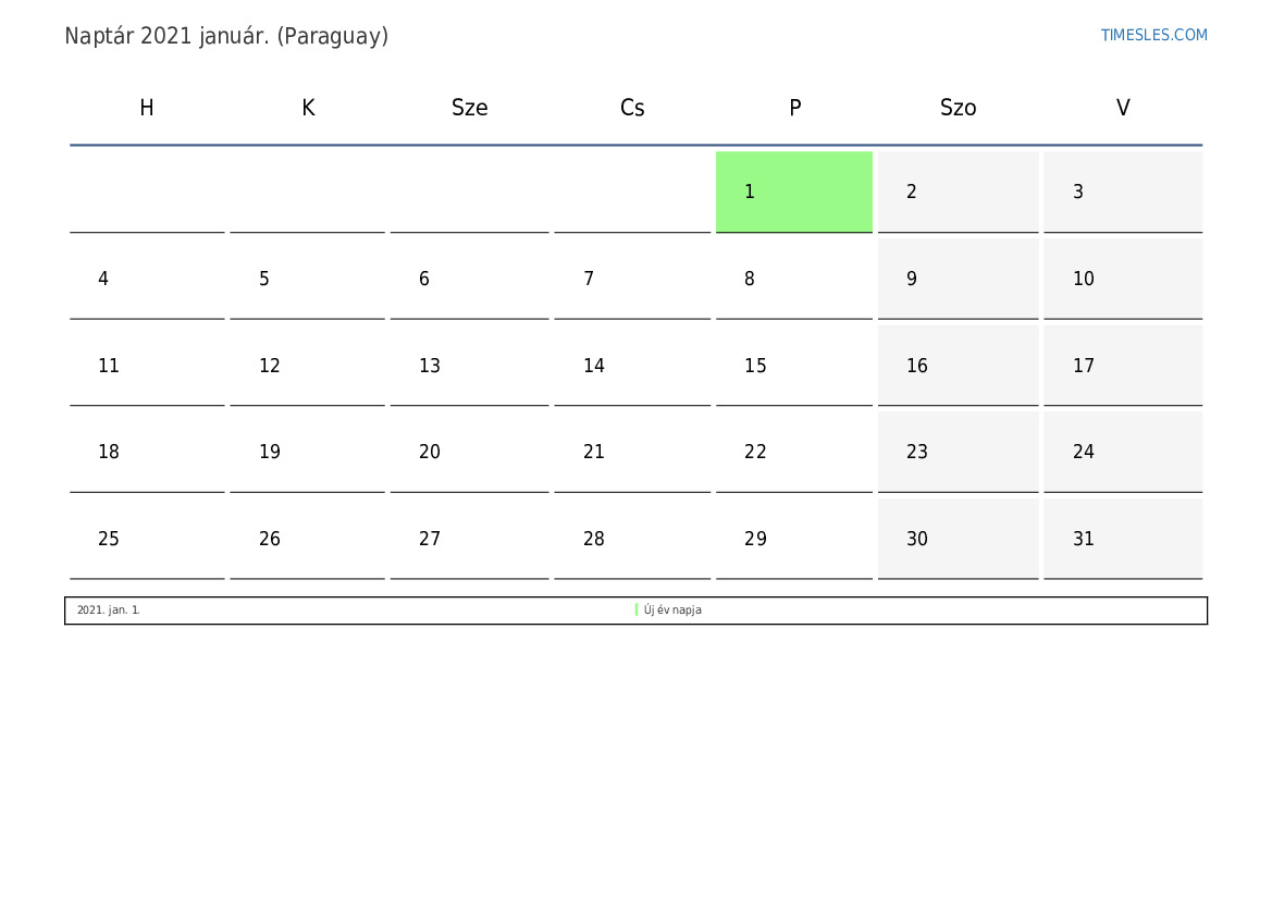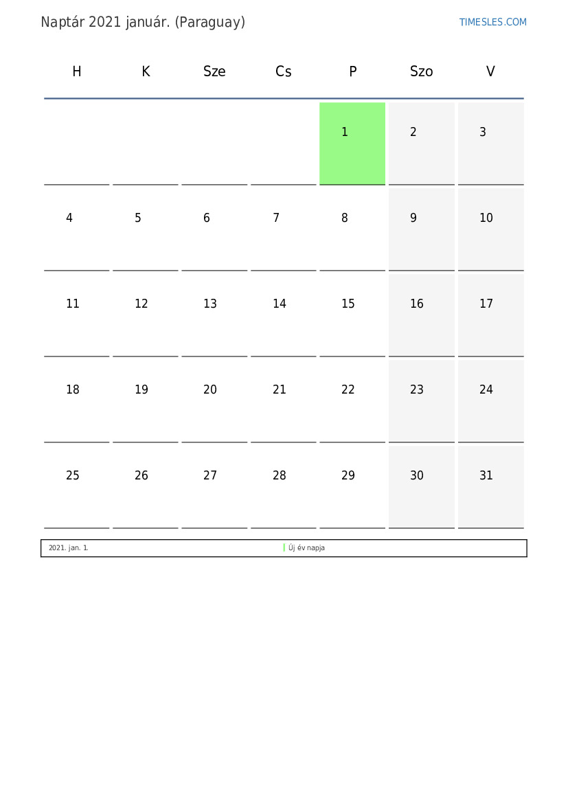 Ünnepek és hétvégi naptár 2021 január Paraguayért