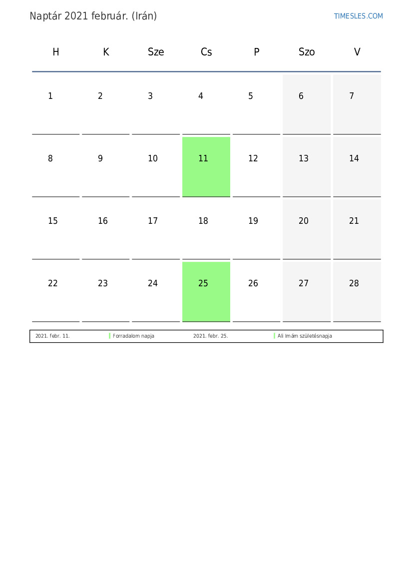 Ünnepek és hétvégi naptár 2021 február Irán számára