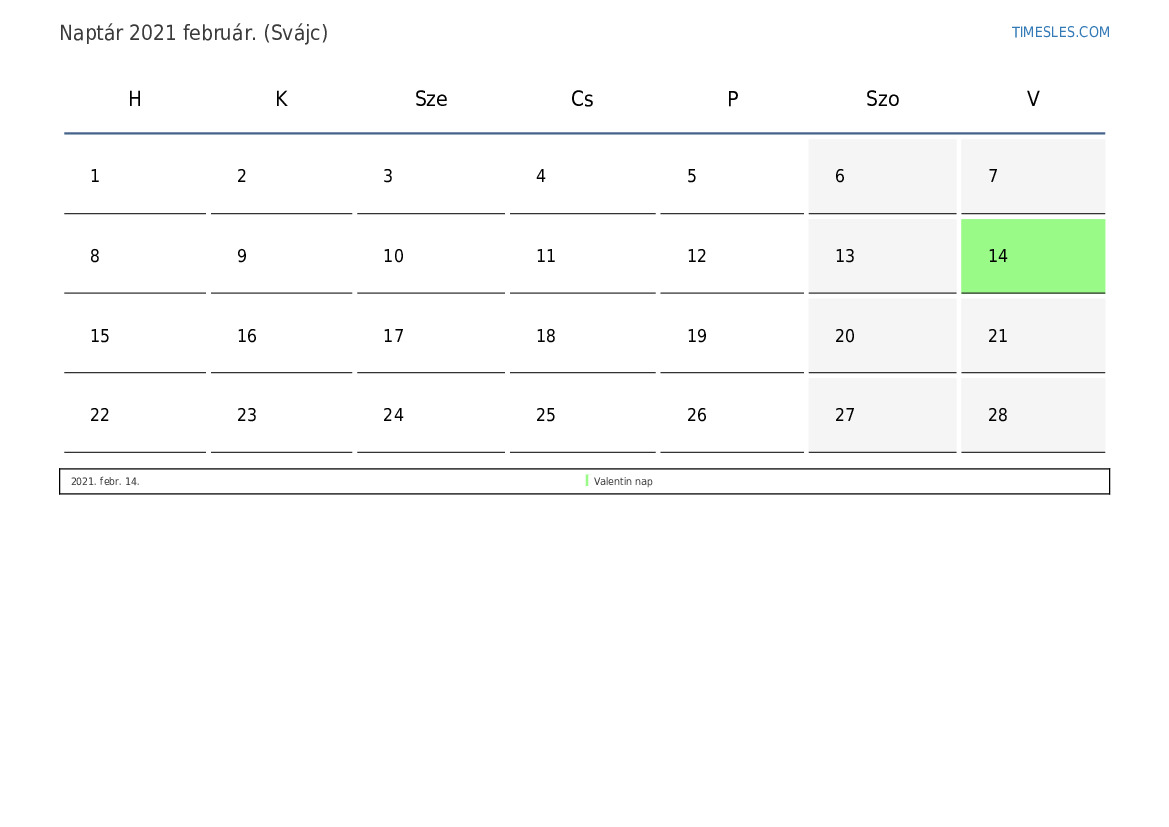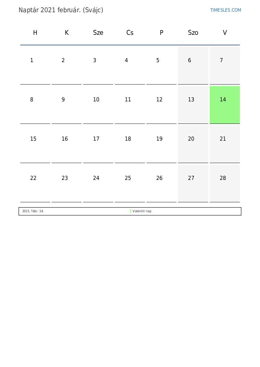 Ünnepek és hétvégi naptár 2021 február Svájcért