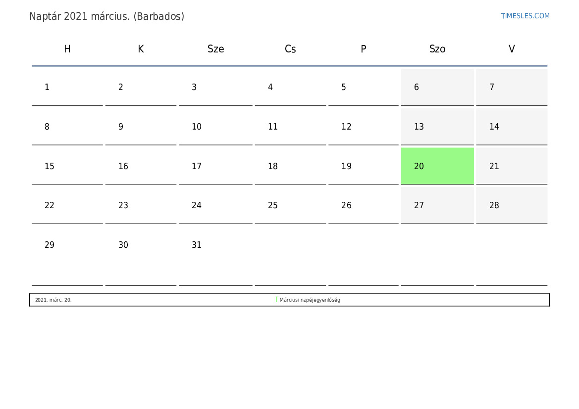 március hónapja 31 nap tartalmaz. Ez 2021 3 hónapja. Az év szezonja: tavaszi. március hónap hétfőn kezdődik és szerdán ér véget. 2021 március 1 ünnep és szabadnap van Barbadoson.