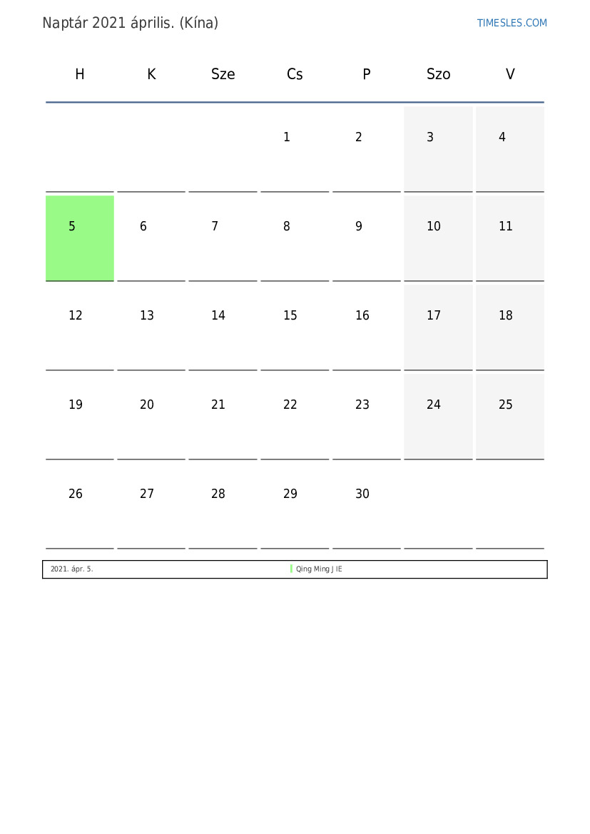 Ünnepek és hétvégi naptár 2021 április Kína számára