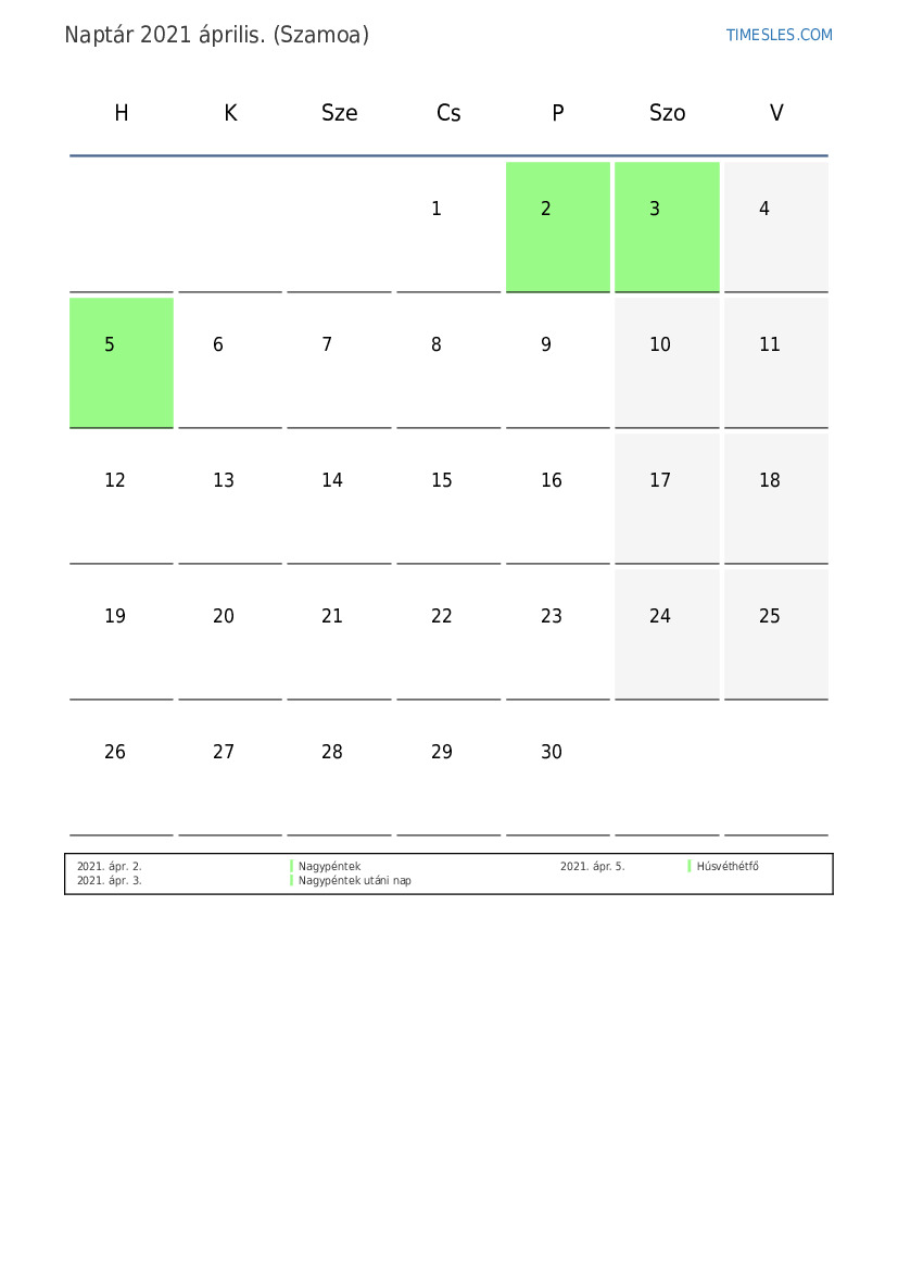 Ünnepek és hétvégi naptár 2021 április Szamoa számára
