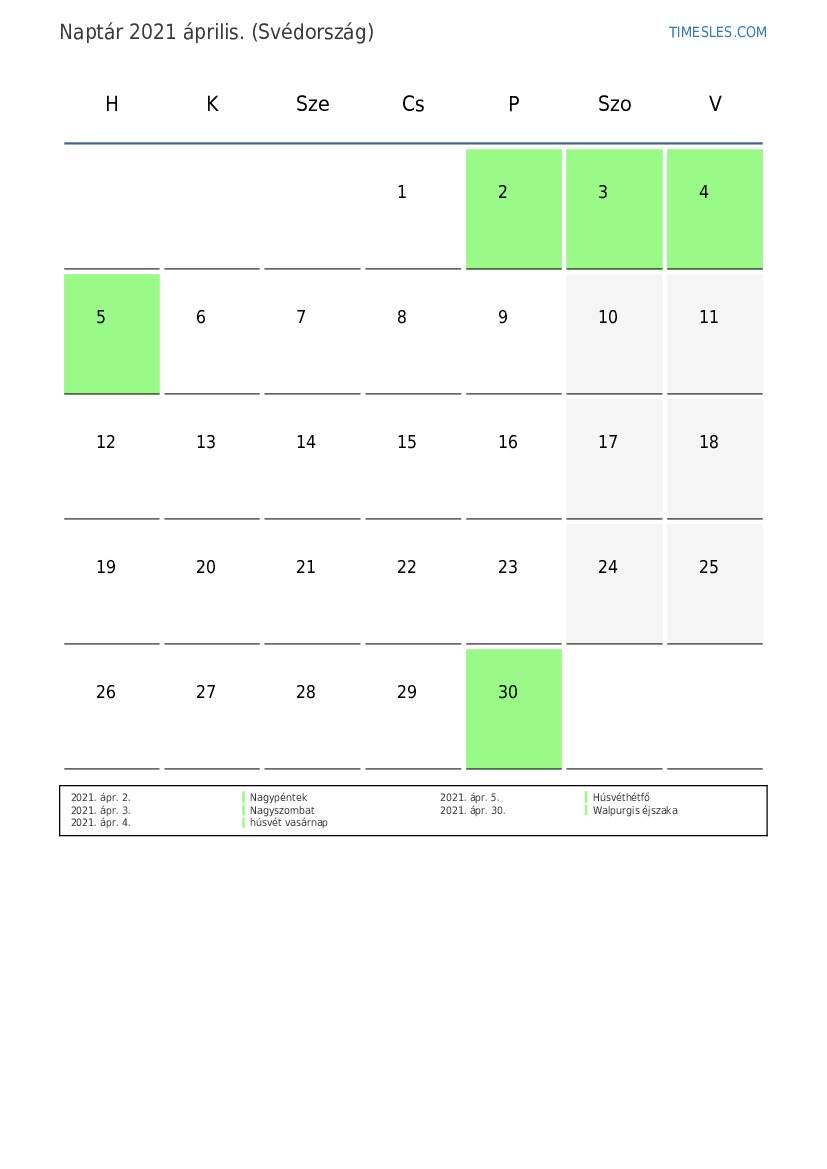 április hónapja 30 nap tartalmaz. Ez 2021 4 hónapja. Az év szezonja: tavaszi. április hónap csütörtökön kezdődik és pénteken ér véget. 2021 április 5 ünnep és szabadnap van Svédországban.