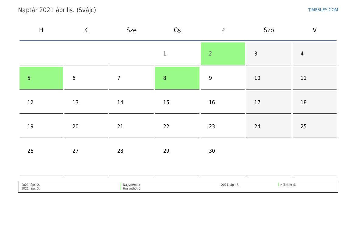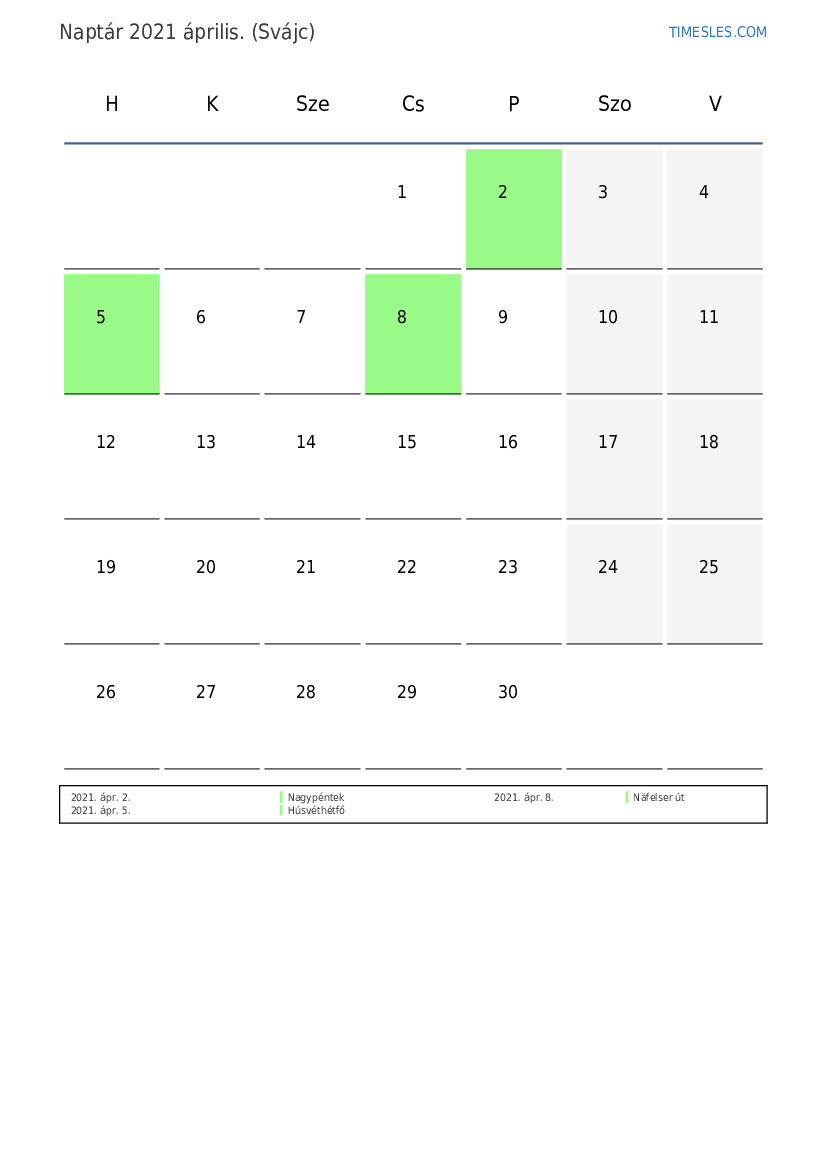 Ünnepek és hétvégi naptár 2021 április Svájcért