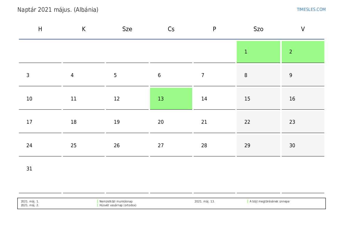 Ünnepek és hétvégi naptár 2021 május Albánia számára