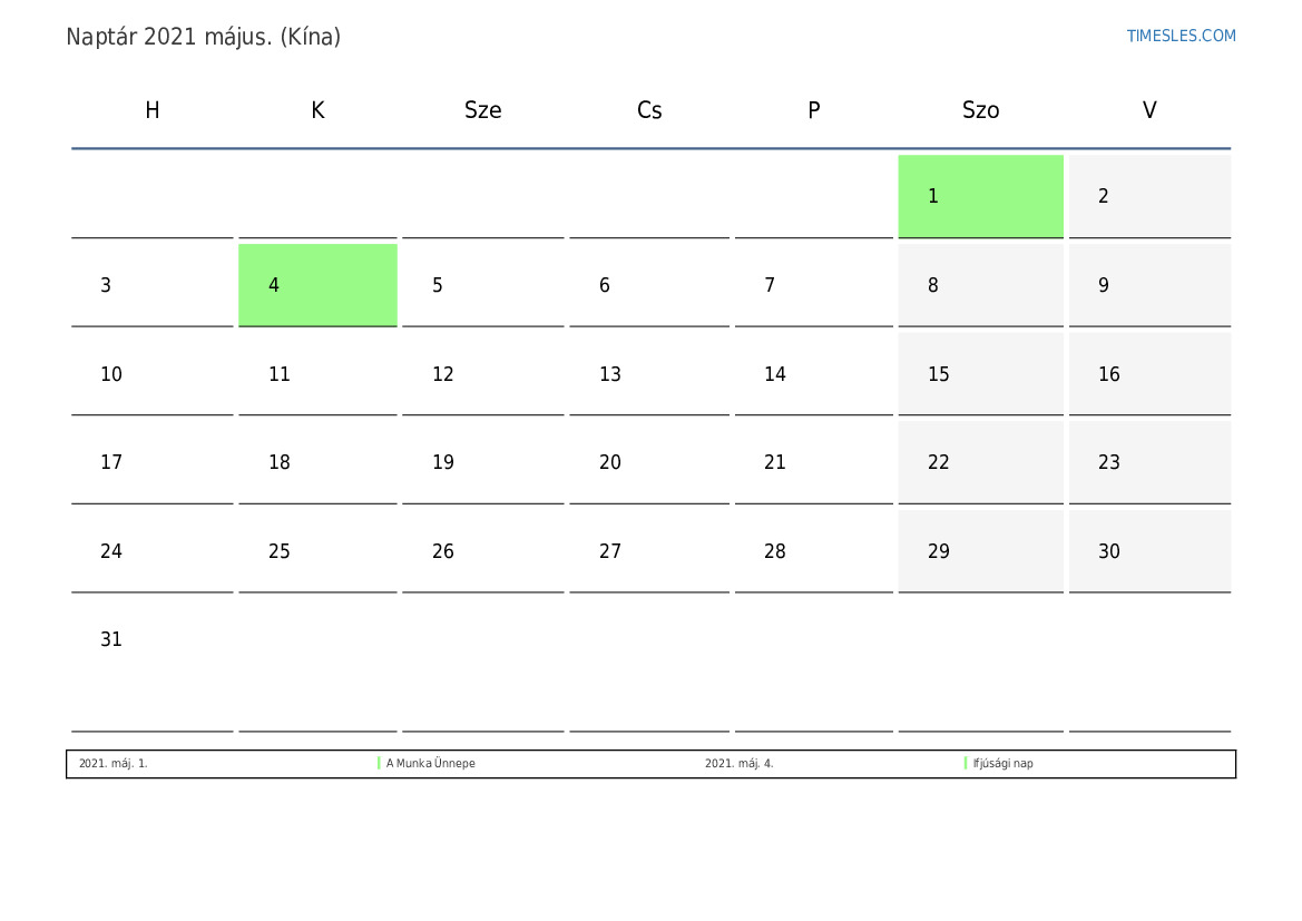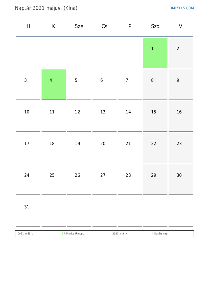 Ünnepek és hétvégi naptár 2021 május Kína számára