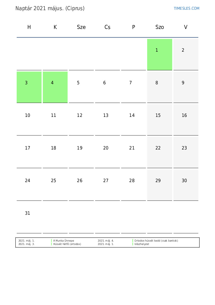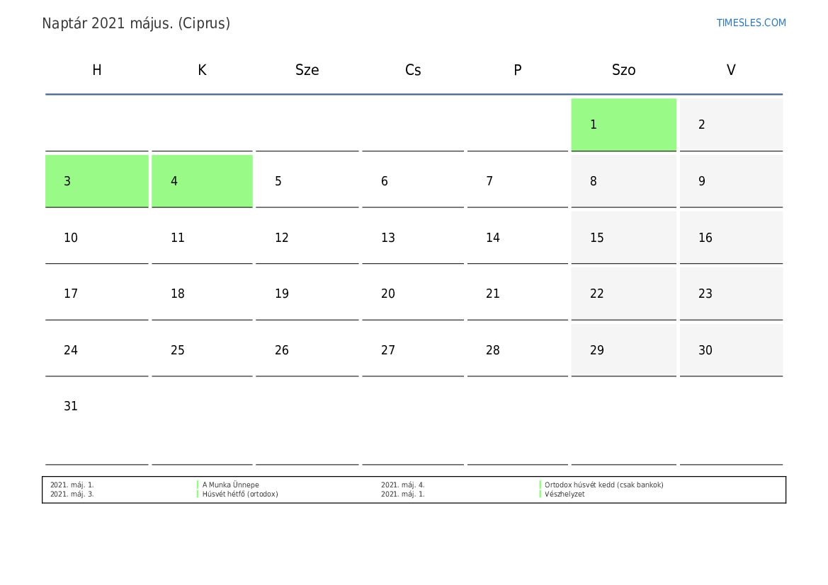 Ünnepek és hétvégi naptár 2021 május Ciprus számára