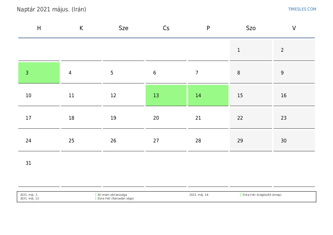 2021. május Irán számára naptára