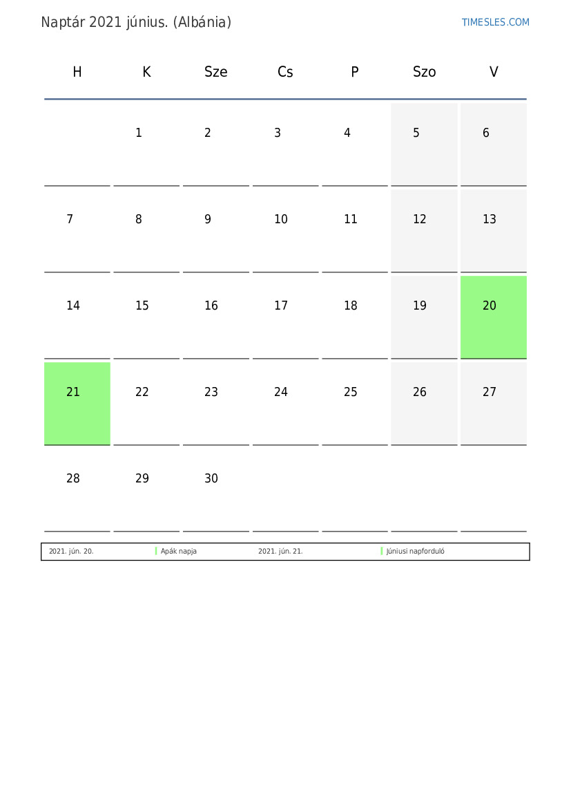 PDF naptár letöltése és nyomtatása ünnepekkel és hétvégékkel 2021 június Albánia számára