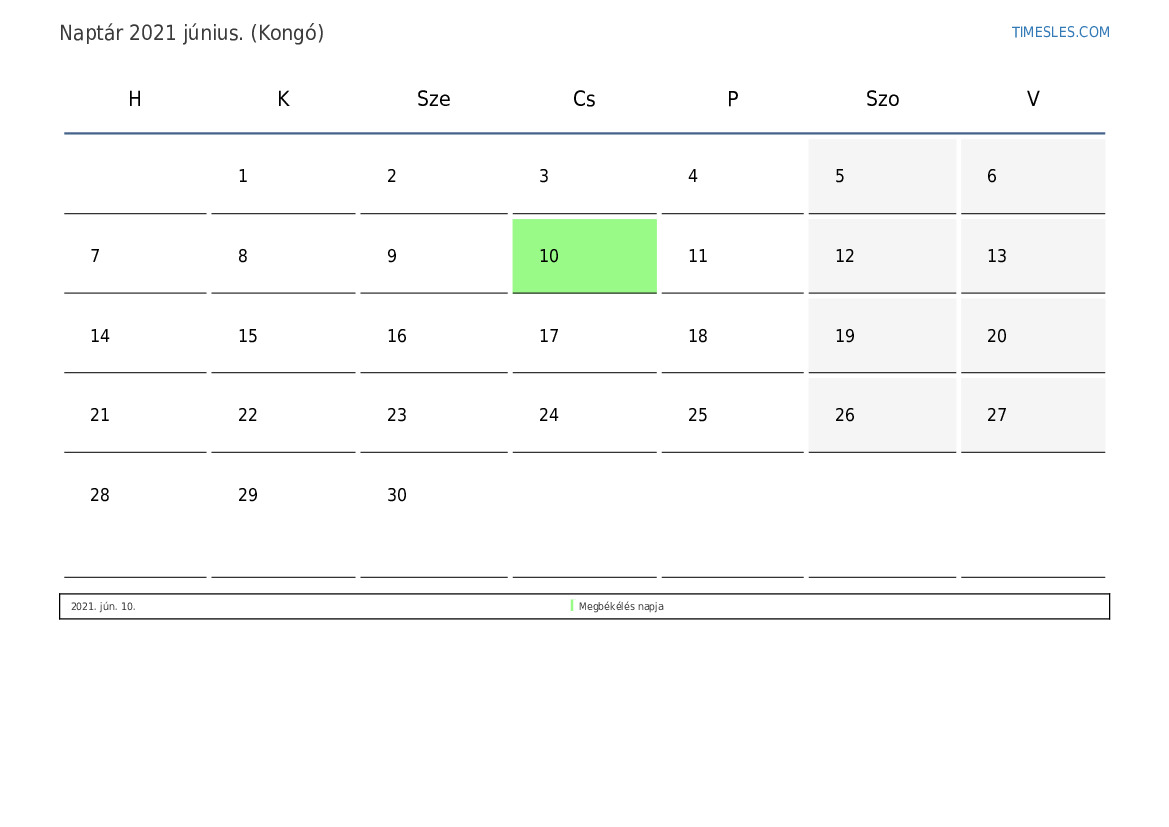 június hónapja 30 nap tartalmaz. Ez 2021 6 hónapja. Az év szezonja: nyár. június hónap kedden kezdődik és szerdán ér véget. 2021 június 3 ünnep és szabadnap van Kongóban.