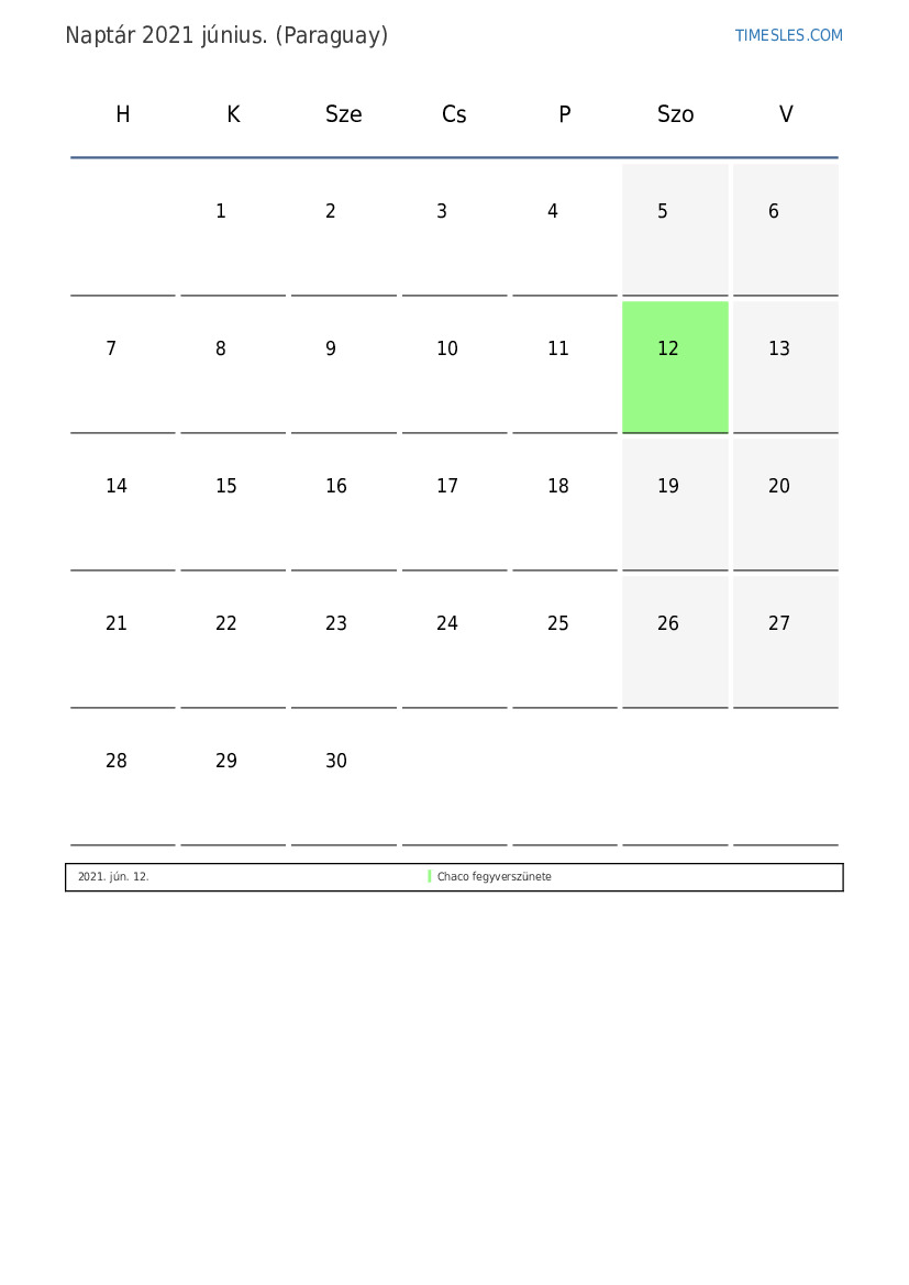 PDF naptár letöltése és nyomtatása ünnepekkel és hétvégékkel 2021 június Paraguayért