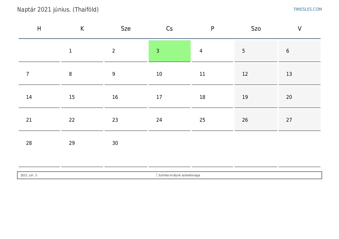 június hónapja 30 nap tartalmaz. Ez 2021 6 hónapja. Az év szezonja: nyár. június hónap kedden kezdődik és szerdán ér véget. 2021 június 2 ünnep és szabadnap van Thaiföldön.