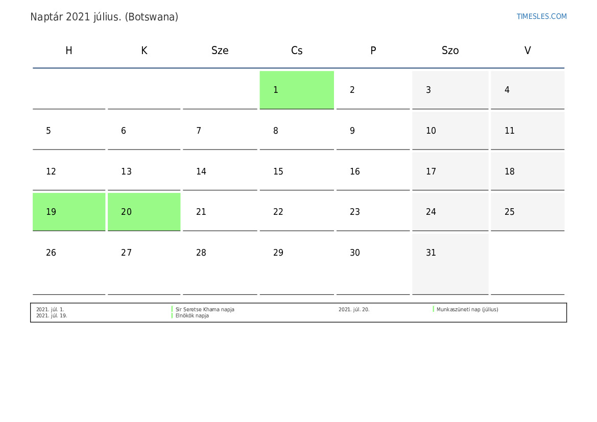 július hónapja 31 nap tartalmaz. Ez 2021 7 hónapja. Az év szezonja: nyár. július hónap csütörtökön kezdődik és szombaton ér véget. 2021 július 3 ünnep és szabadnap van Botswanában.