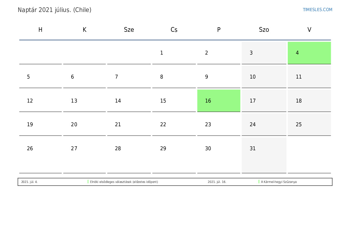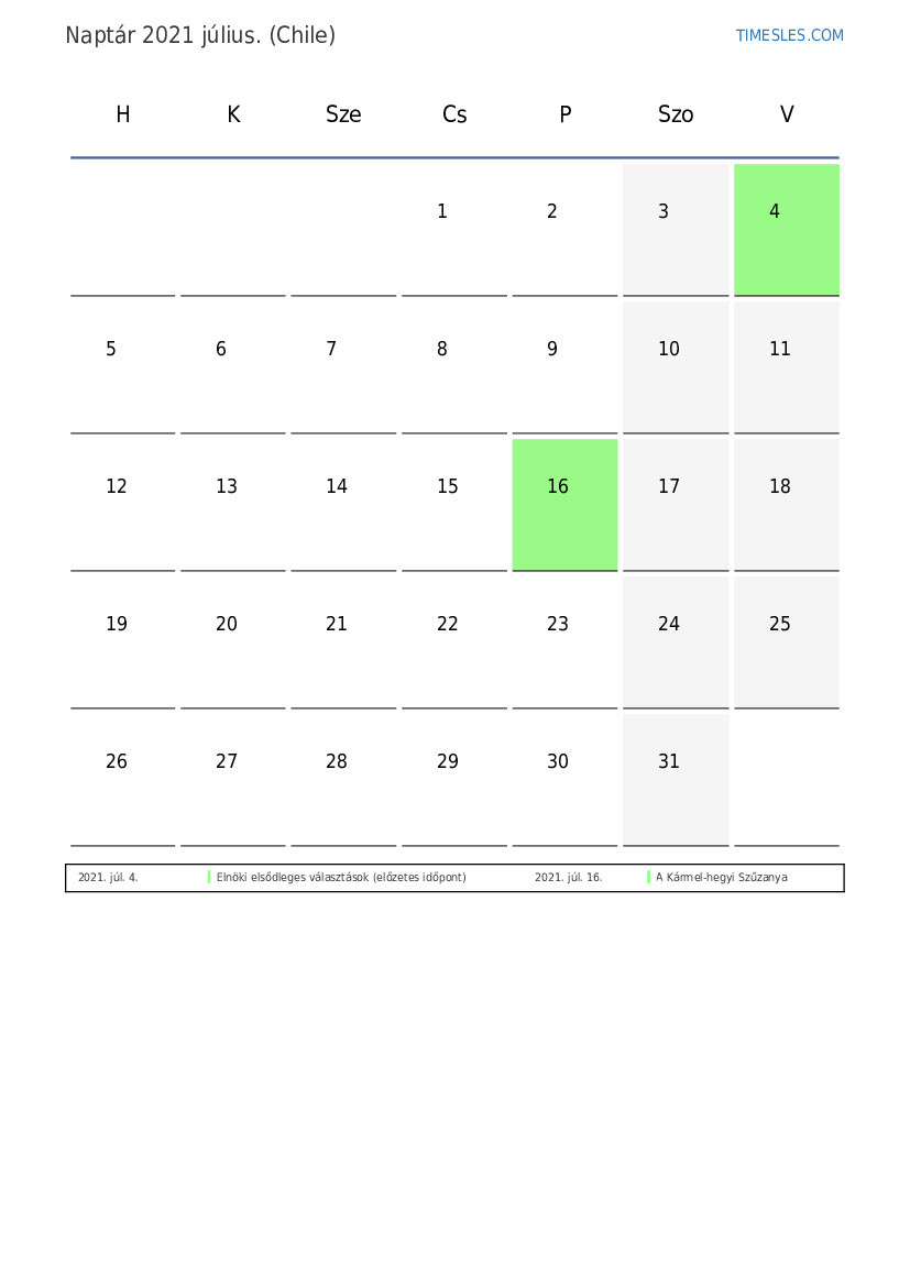 Ünnepek és hétvégi naptár 2021 július Chile számára