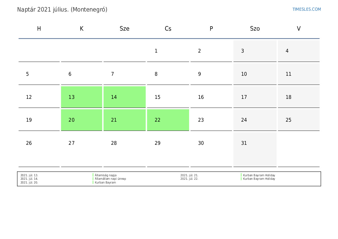 július hónapja 31 nap tartalmaz. Ez 2021 7 hónapja. Az év szezonja: nyár. július hónap csütörtökön kezdődik és szombaton ér véget. 2021 július 5 ünnep és szabadnap van Montenegróban.