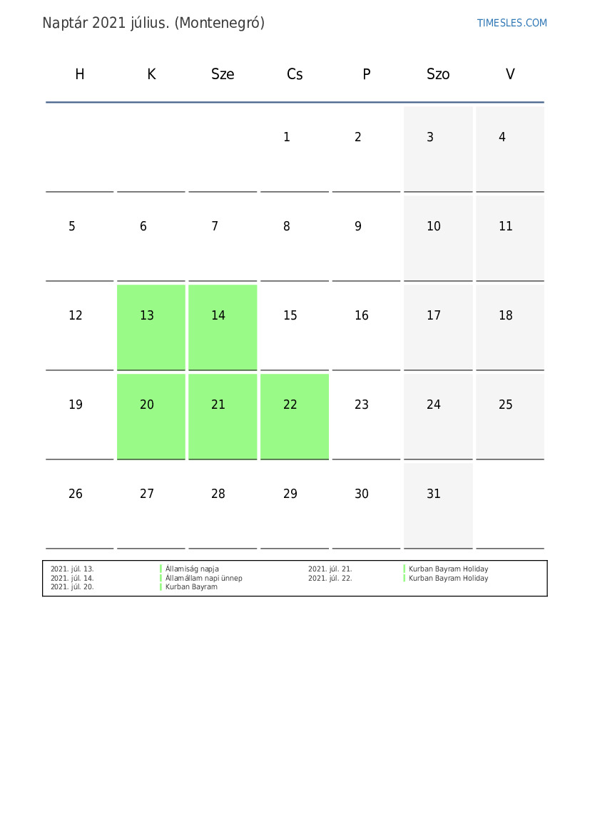 Ünnepek és hétvégi naptár 2021 július Montenegró számára