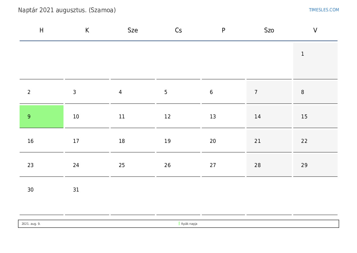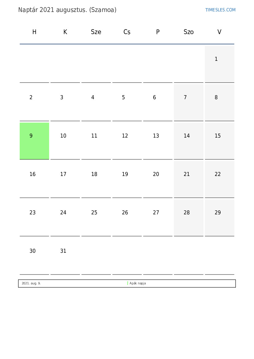Ünnepek és hétvégi naptár 2021 augusztus Szamoa számára