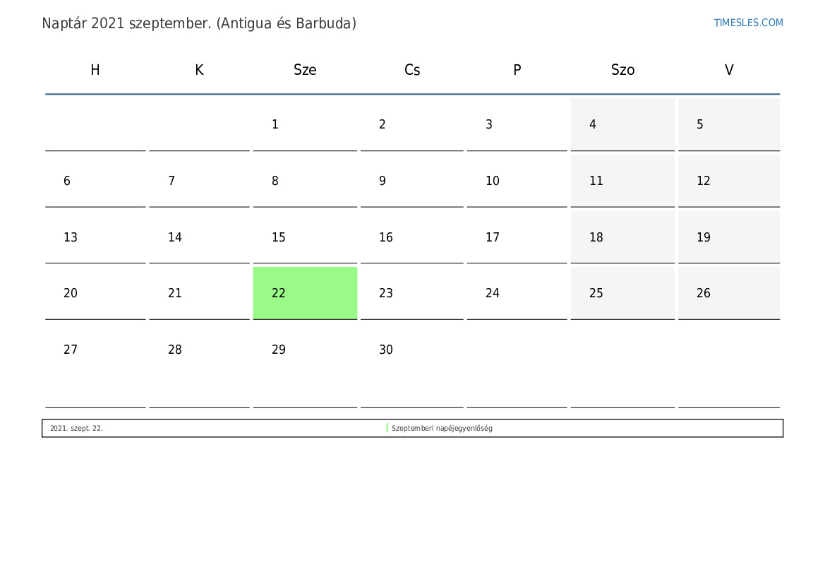 szeptember hónapja 30 nap tartalmaz. Ez 2021 9 hónapja. Az év szezonja: ősz. szeptember hónap szerdán kezdődik és csütörtökön ér véget. 2021 szeptember 1 ünnep és szabadnap van Antigua és Barbuda területén.