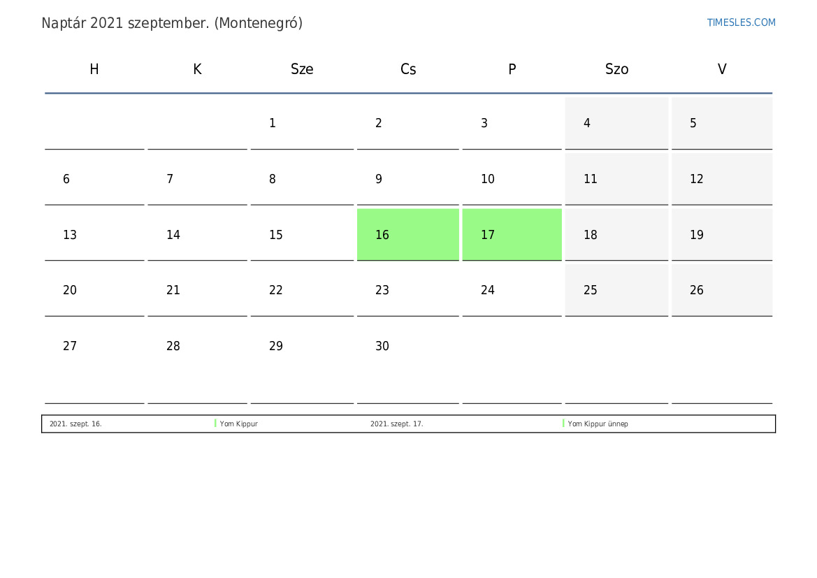 Ünnepek és hétvégi naptár 2021 szeptember Montenegró számára