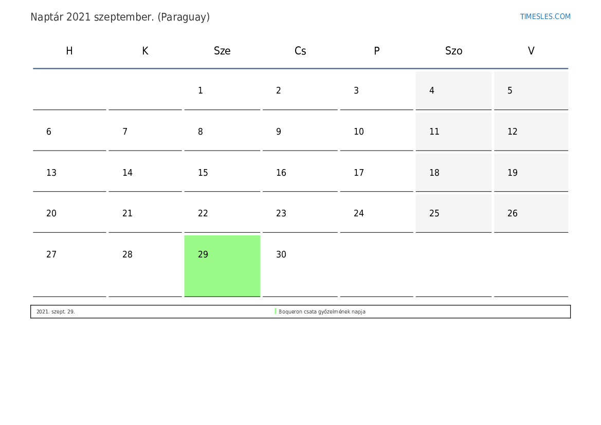 PDF naptár letöltése és nyomtatása ünnepekkel és hétvégékkel 2021 szeptember Paraguayért