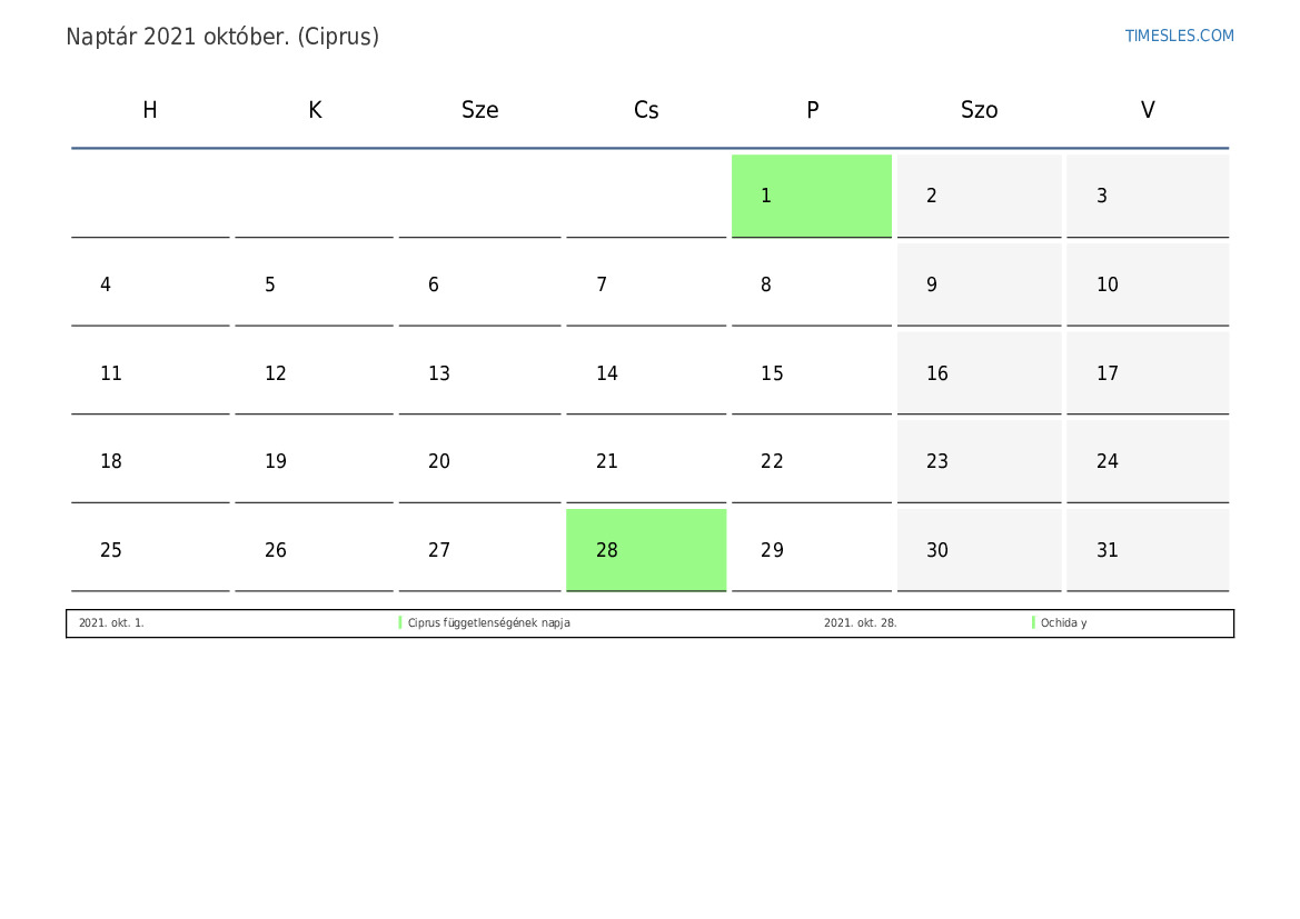 Ünnepek és hétvégi naptár 2021 október Ciprus számára
