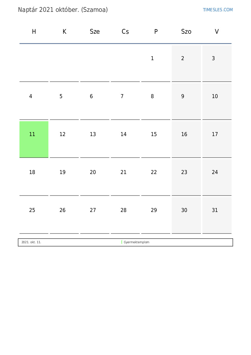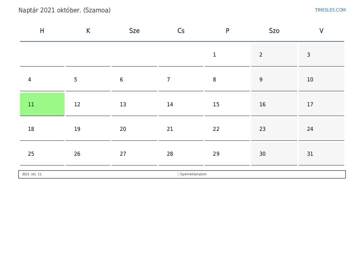 Ünnepek és hétvégi naptár 2021 október Szamoa számára