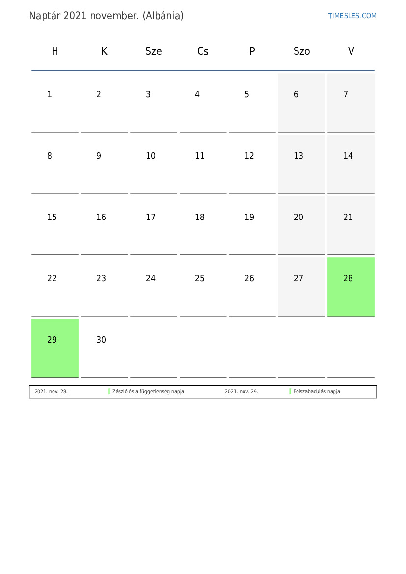 Ünnepek és hétvégi naptár 2021 november Albánia számára