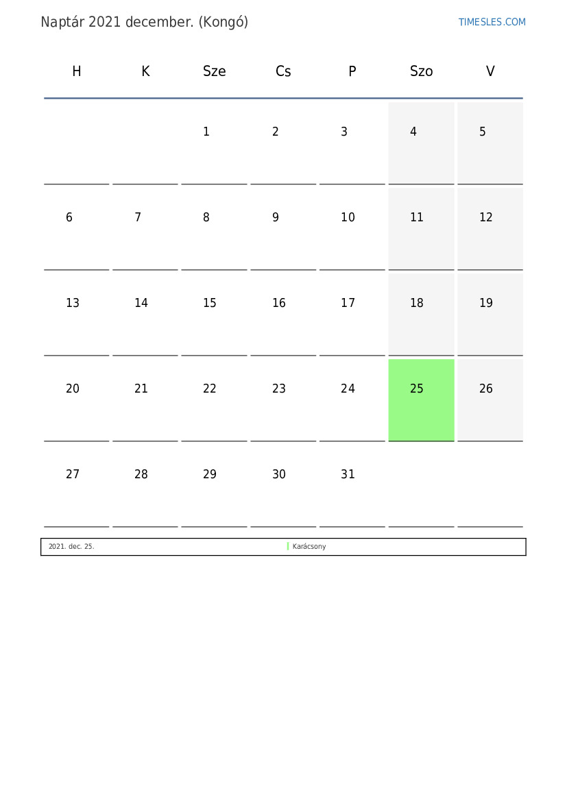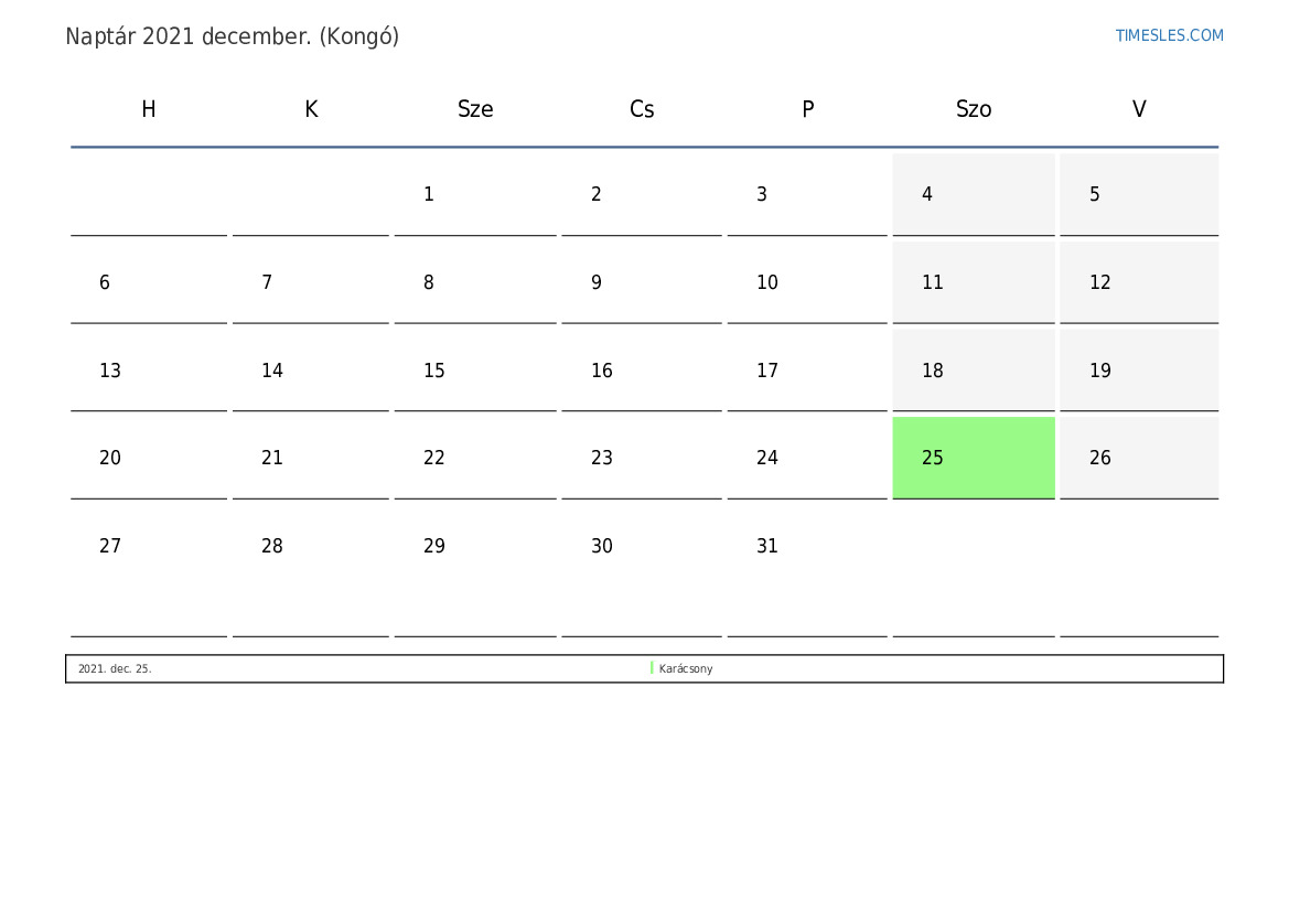 december hónapja 31 nap tartalmaz. Ez 2021 12 hónapja. Az év szezonja: téli. december hónap szerdán kezdődik és pénteken ér véget. 2021 december 2 ünnep és szabadnap van Kongóban.