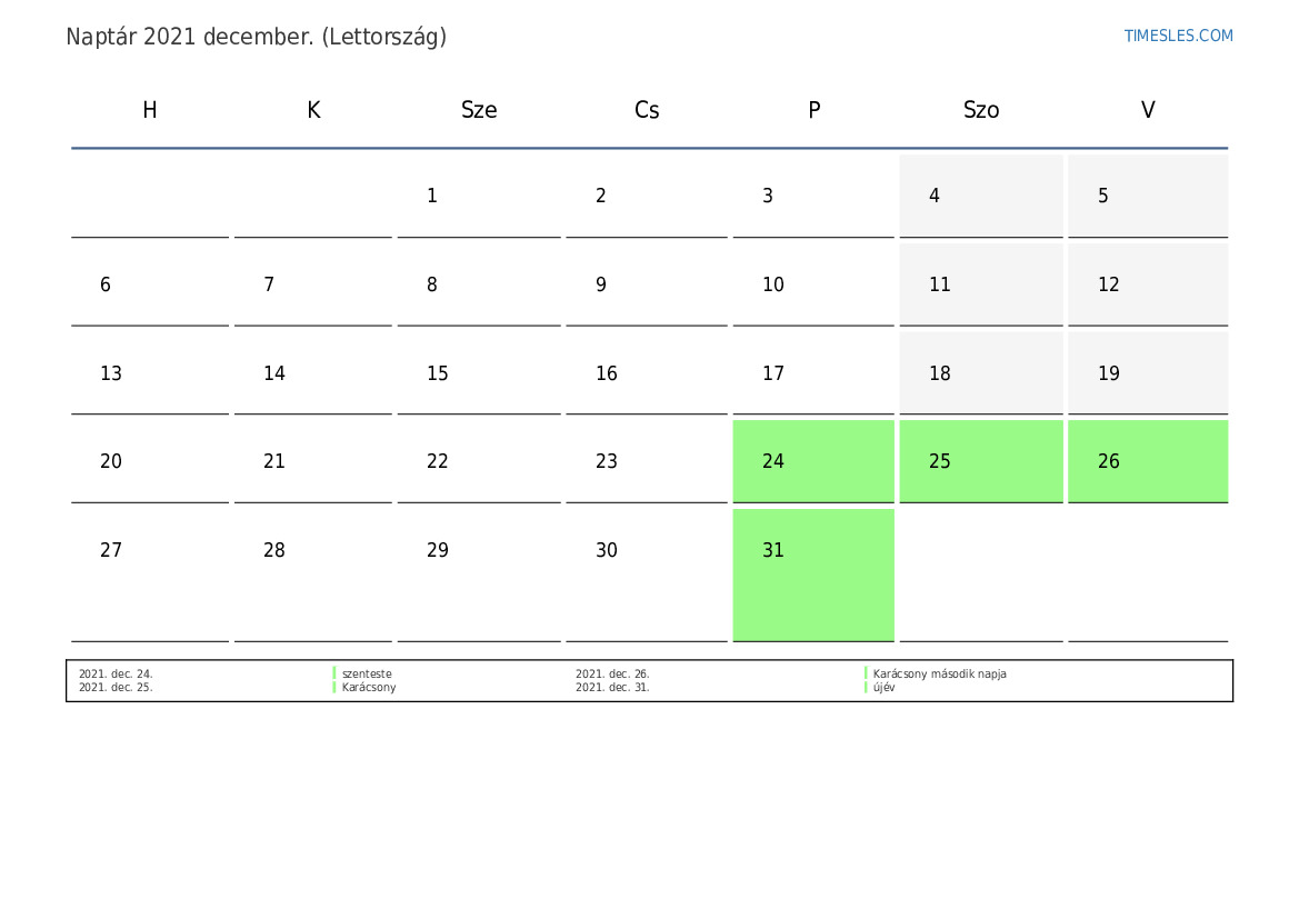 december hónapja 31 nap tartalmaz. Ez 2021 12 hónapja. Az év szezonja: téli. december hónap szerdán kezdődik és pénteken ér véget. 2021 december 5 ünnep és szabadnap van Lettországban.