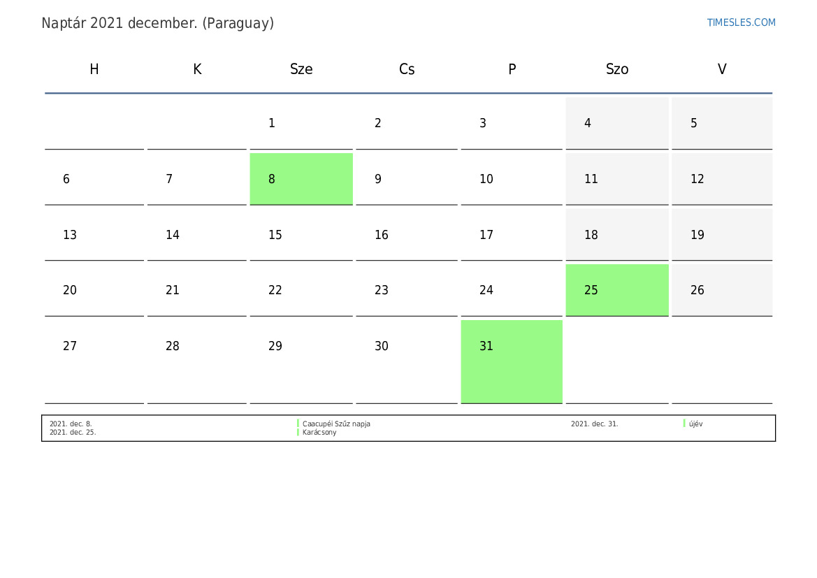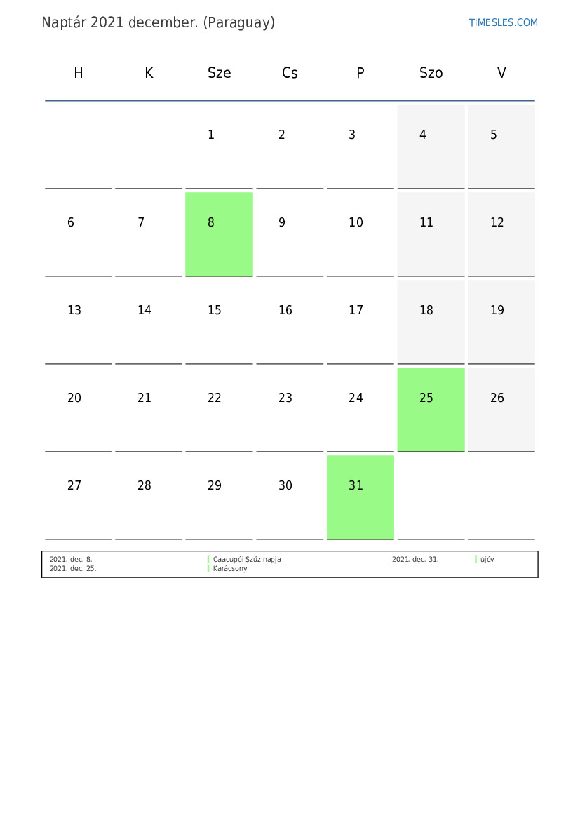 Ünnepek és hétvégi naptár 2021 december Paraguayért