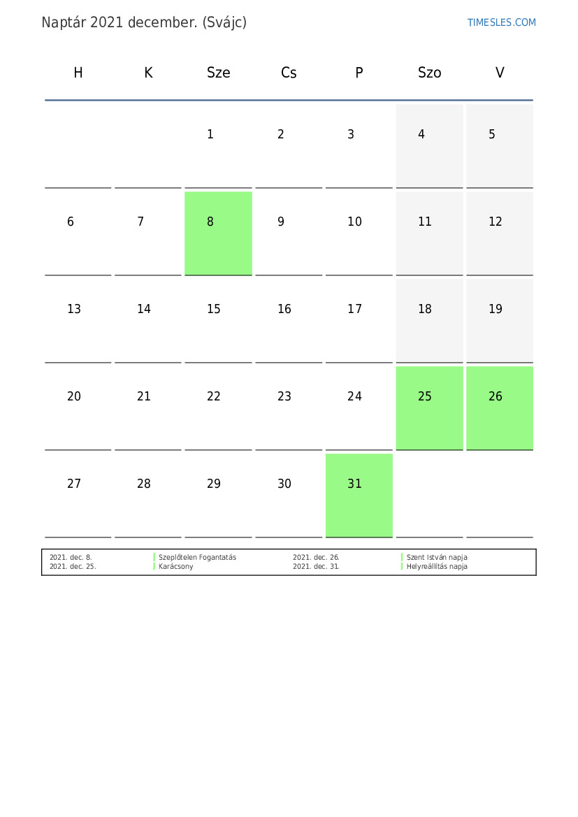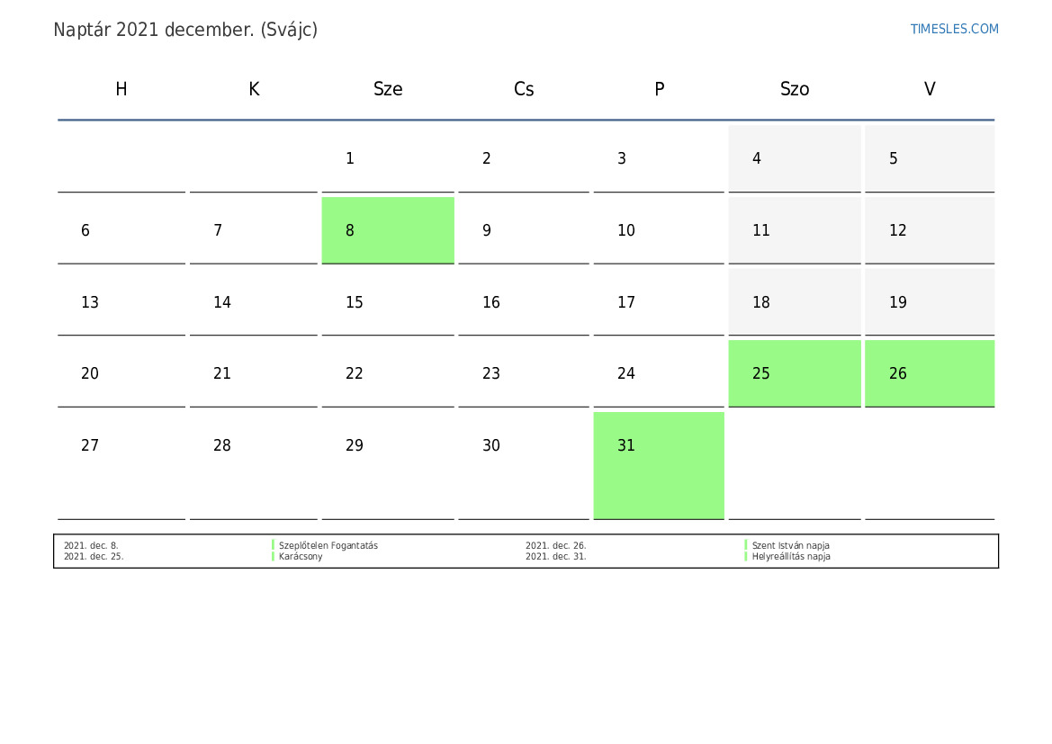Ünnepek és hétvégi naptár 2021 december Svájcért