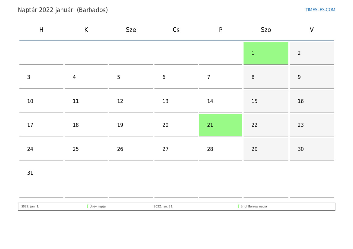 Ünnepek és hétvégi naptár 2022 január Barbados számára