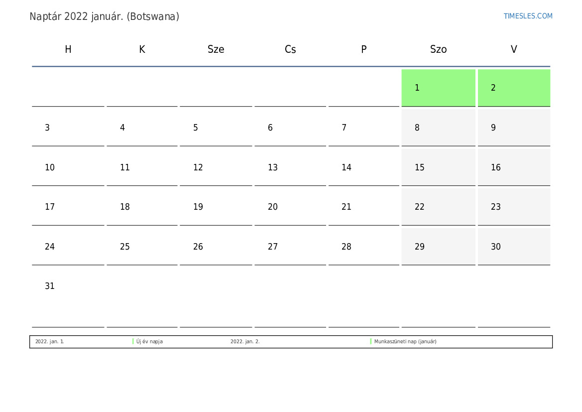 Ünnepek és hétvégi naptár 2022 január Botswanának