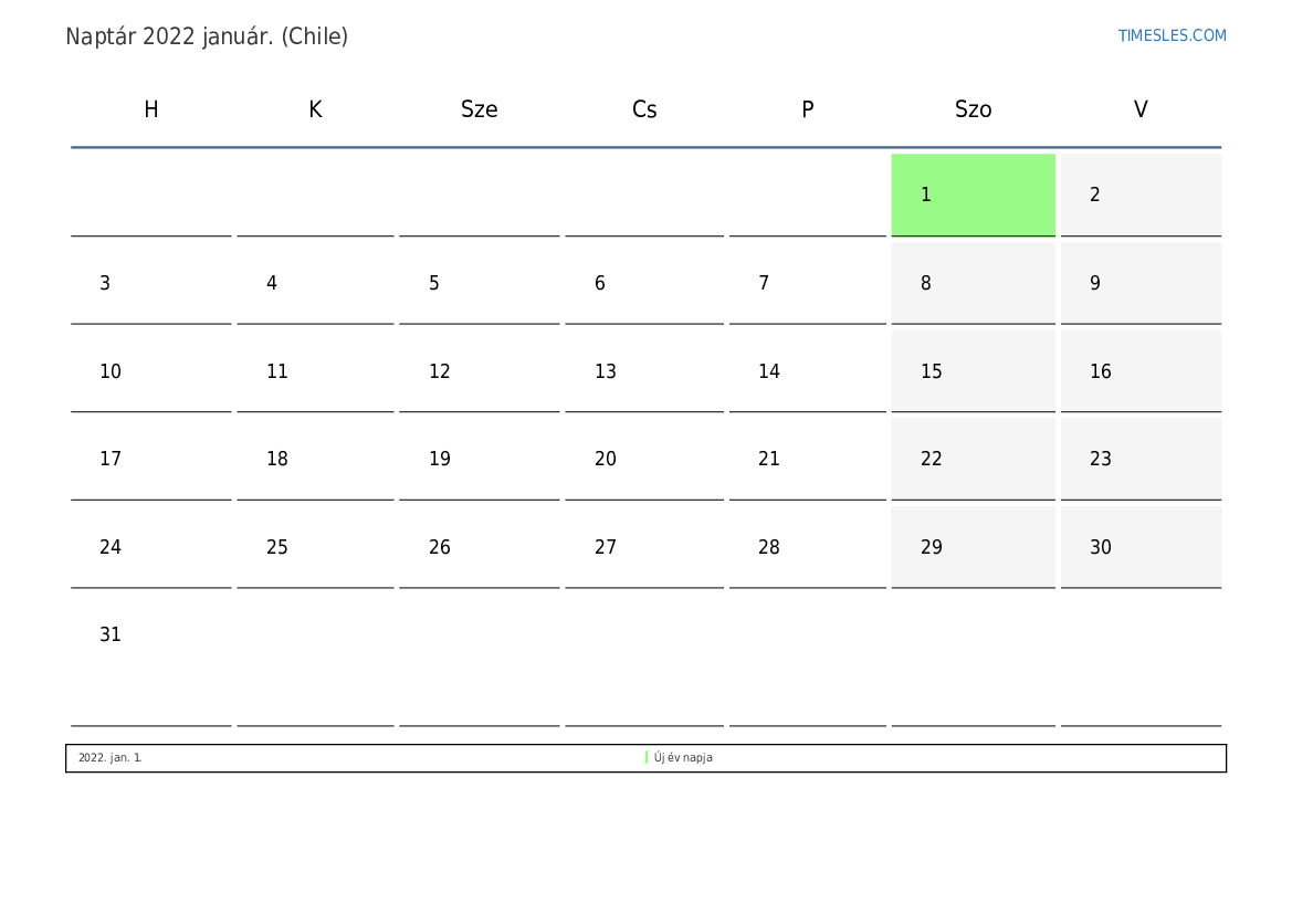 január hónapja 31 nap tartalmaz. Ez 2022 1 hónapja. Az év szezonja: téli. január hónap szombaton kezdődik és hétfőn ér véget. 2022 január 1 ünnep és szabadnap van Chilében.