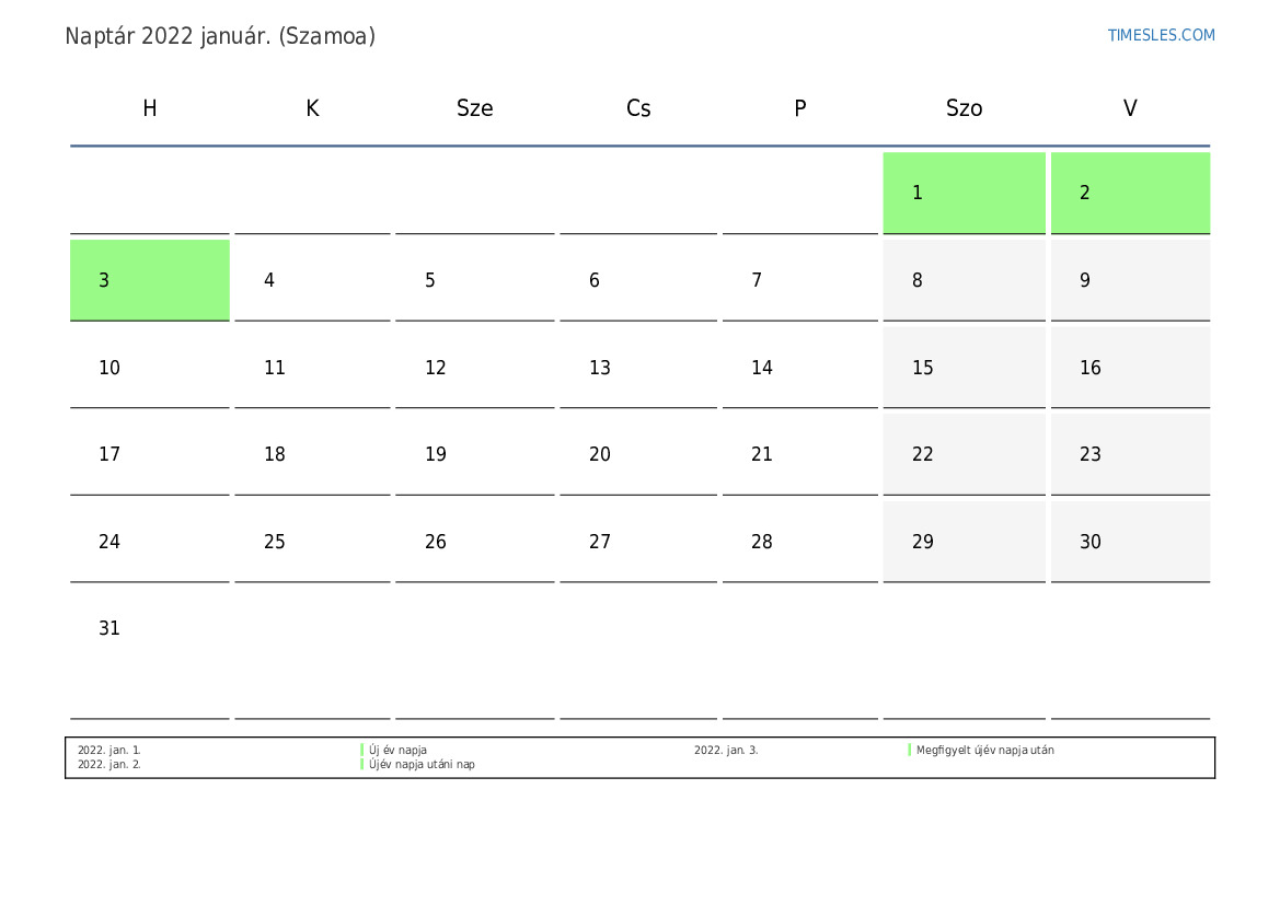 január hónapja 31 nap tartalmaz. Ez 2022 1 hónapja. Az év szezonja: téli. január hónap szombaton kezdődik és hétfőn ér véget. 2022 január 3 ünnep és szabadnap van Szamoa-ban.