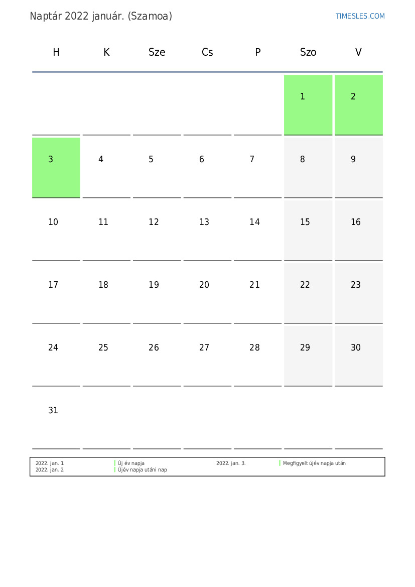 Ünnepek és hétvégi naptár 2022 január Szamoa számára
